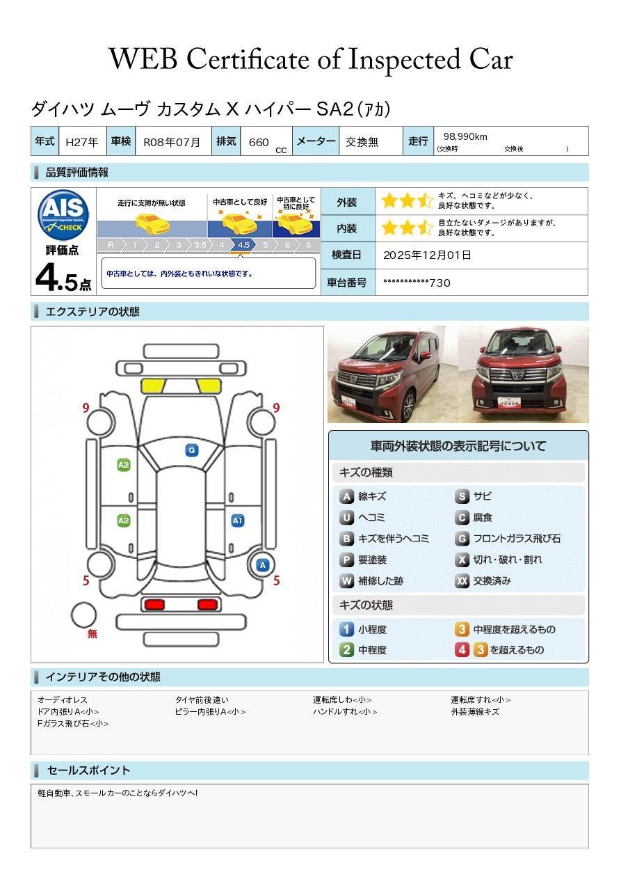 車両状態証明書が付いておりますので、安心してお選び出来ます。詳しくは、スタッフまでお気軽にお問合せください。