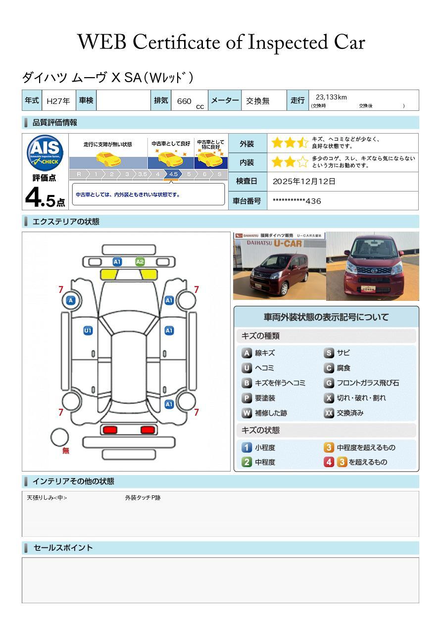 ダイハツ認定中古車なら展示車両の状態を開示しております。展示車両に自信があるからこそ出来るサービスです。