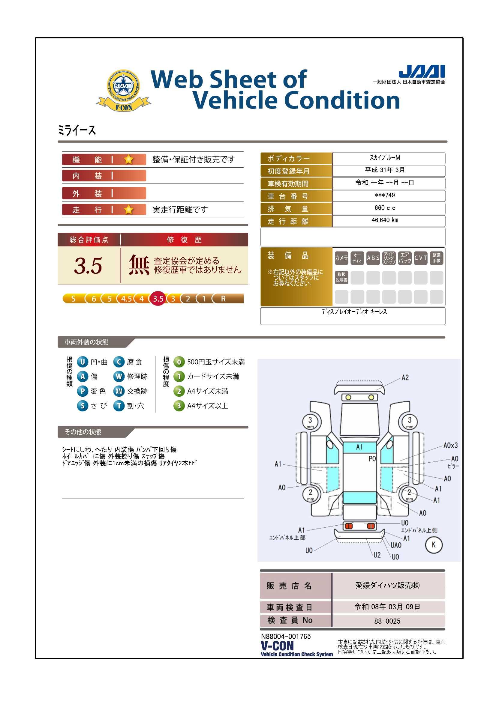 現状の車両の状態に関しましては必ず販売店に確認をお願いします。(2008年10月からの評価基準改定により、一部の車両につき店頭の評価表記と違う場合がございます。詳しくは販売店にお問い合わせください。