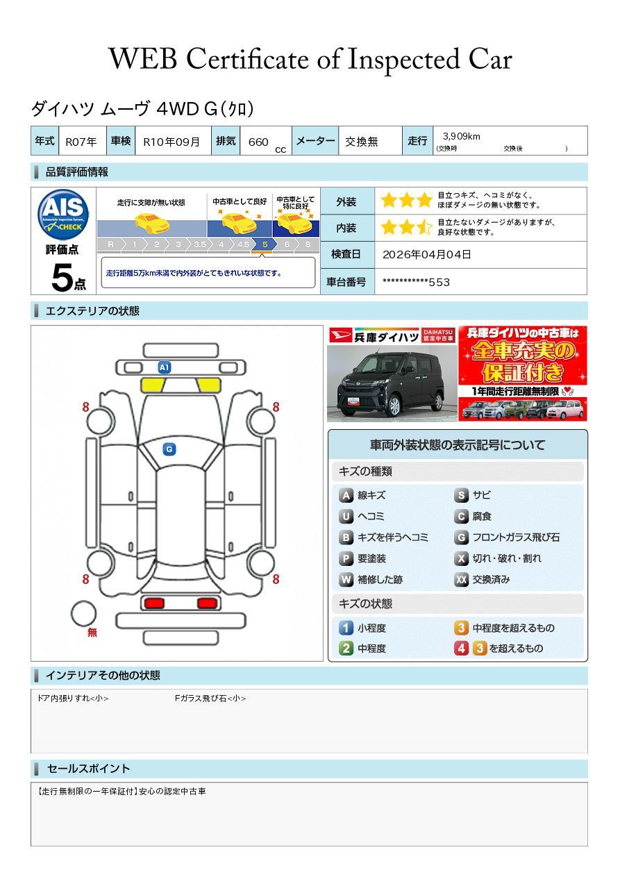 車両状態証明書が付いておりますので、安心してお選び出来ます。詳しくは、スタッフまでお気軽にお問合せください。