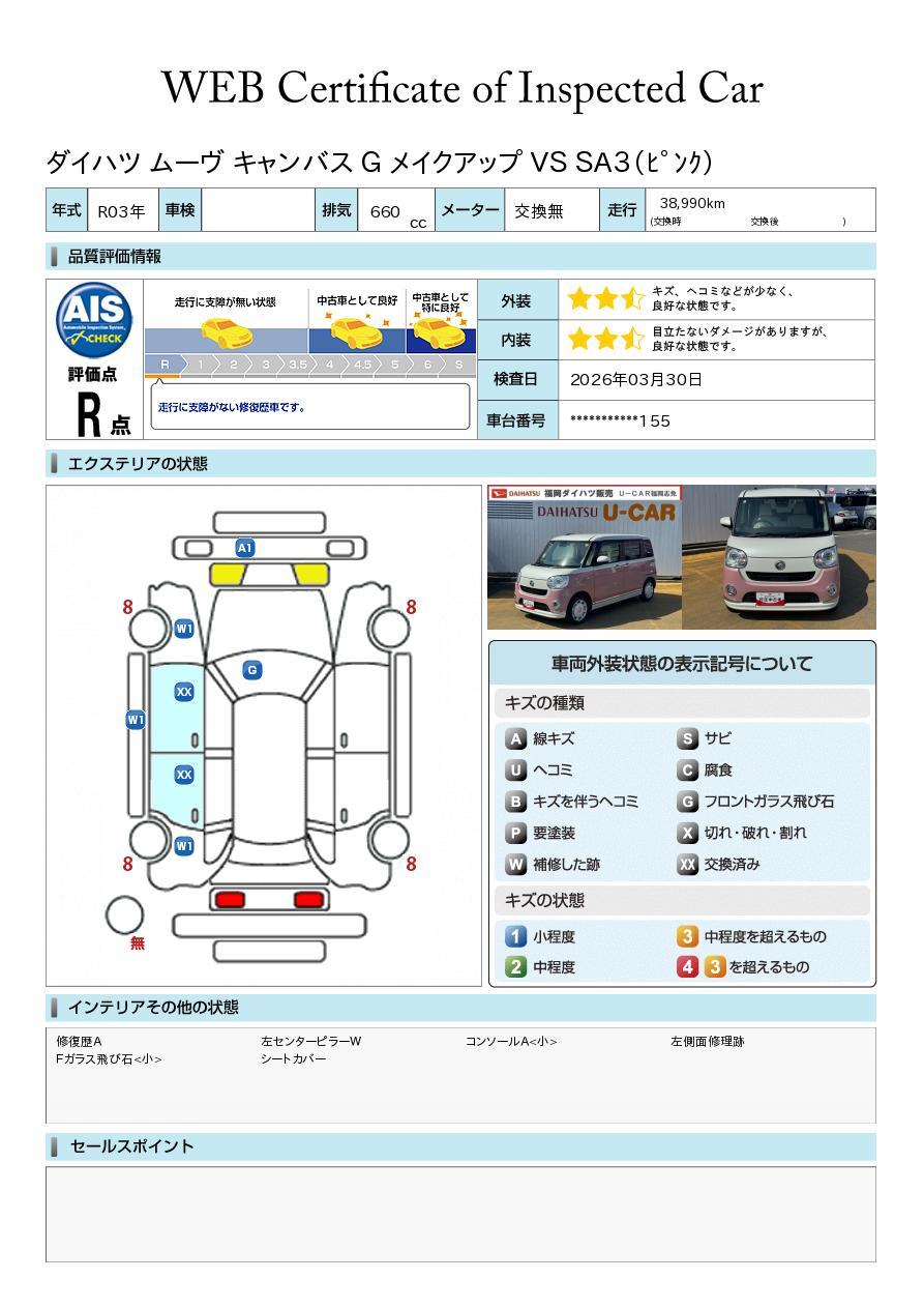 車両状態証明書が付いておりますので、安心してお選び出来ます。詳しくは、スタッフまでお気軽にお問合せください。
