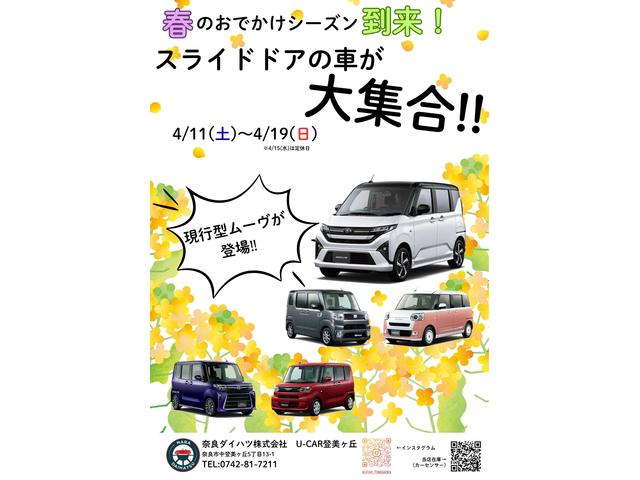 春のお出かけシ−ズン到来!!スライドドアのお車が大集合!!ついに!現行ム−ヴが登場!・フェア期間内にご成約いただいた方!!「ガソリン満タン納車」プレゼント!・用品3万円プレゼント!・来場記念品ごプレゼント!ぜひこの機会にU−CAR登美ヶ丘へお越しくださいませ(^^♪