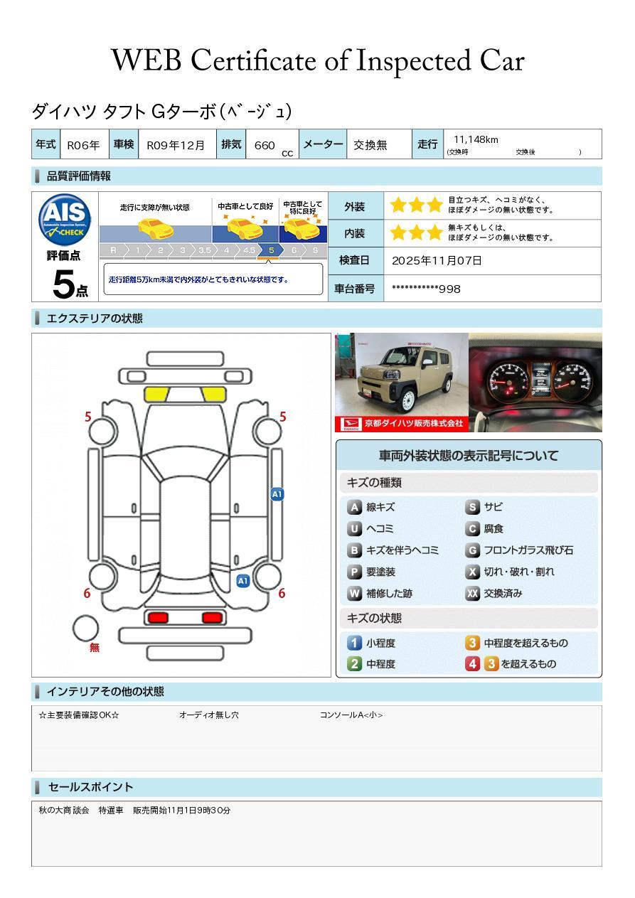 タフトGターボ 4WD オーディオレス プッシュスタート4WD オーディオレス キーフリーシステム プッシュスタート 電動パーキングブレーキ オートエアコン オートライト オートハイビーム LEDヘッドライト LEDフォグランプ 全方位カメラ(京都府)の中古車