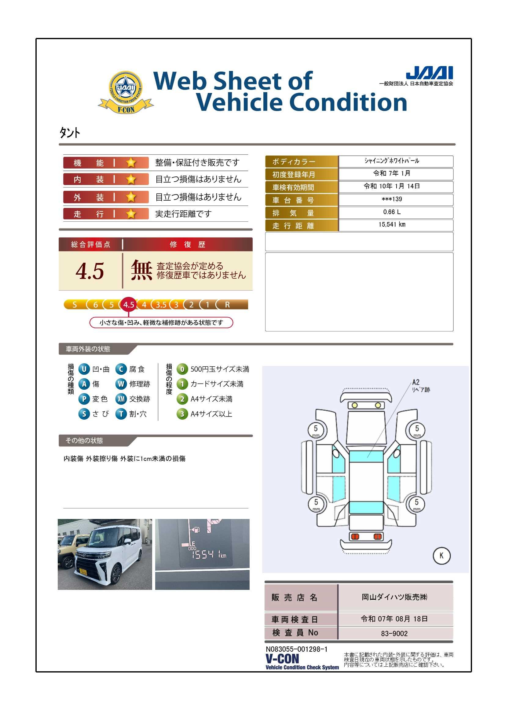 現状の車両の状態に関しましては必ず販売店に確認をお願いします。(2008年10月からの評価基準改定により、一部の車両につき店頭の評価表記と違う場合がございます。詳しくは販売店にお問い合わせください。