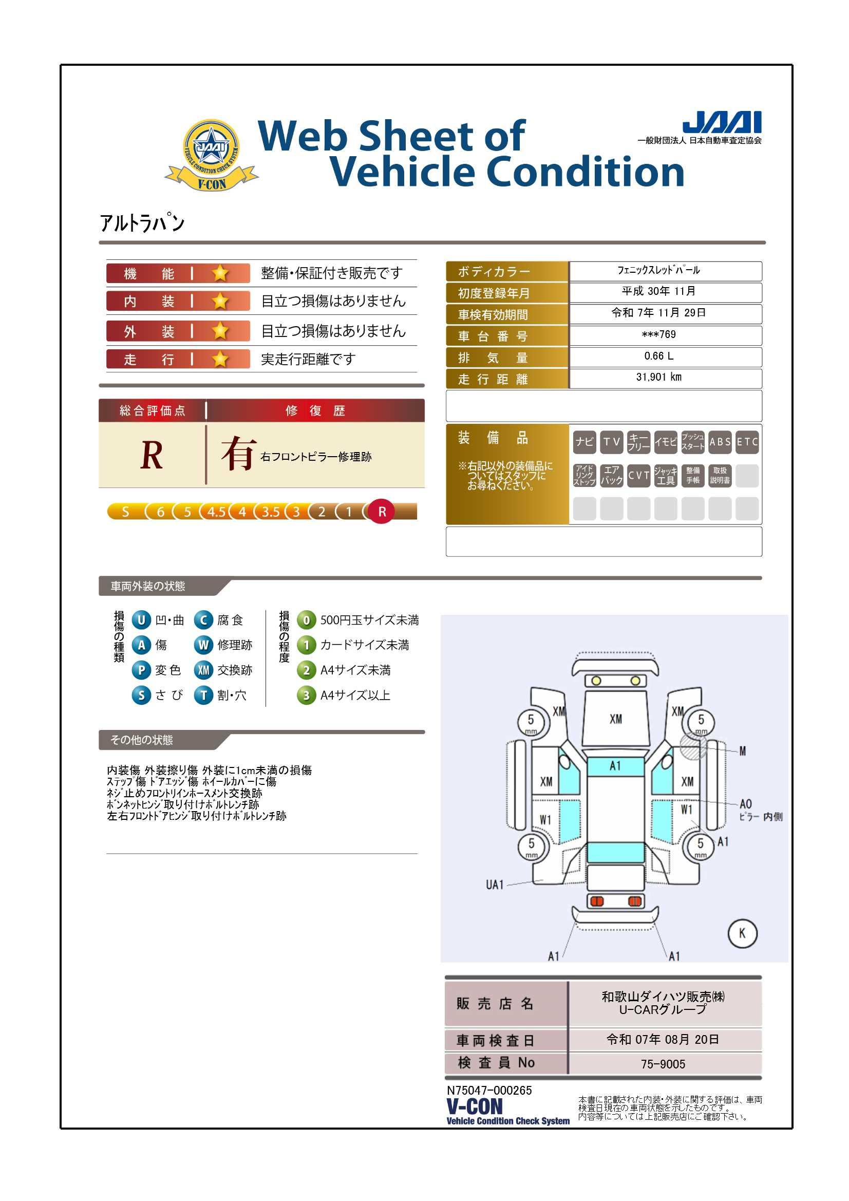 一般財団法人 日本自動車査定協会の車両状態証明書となります。