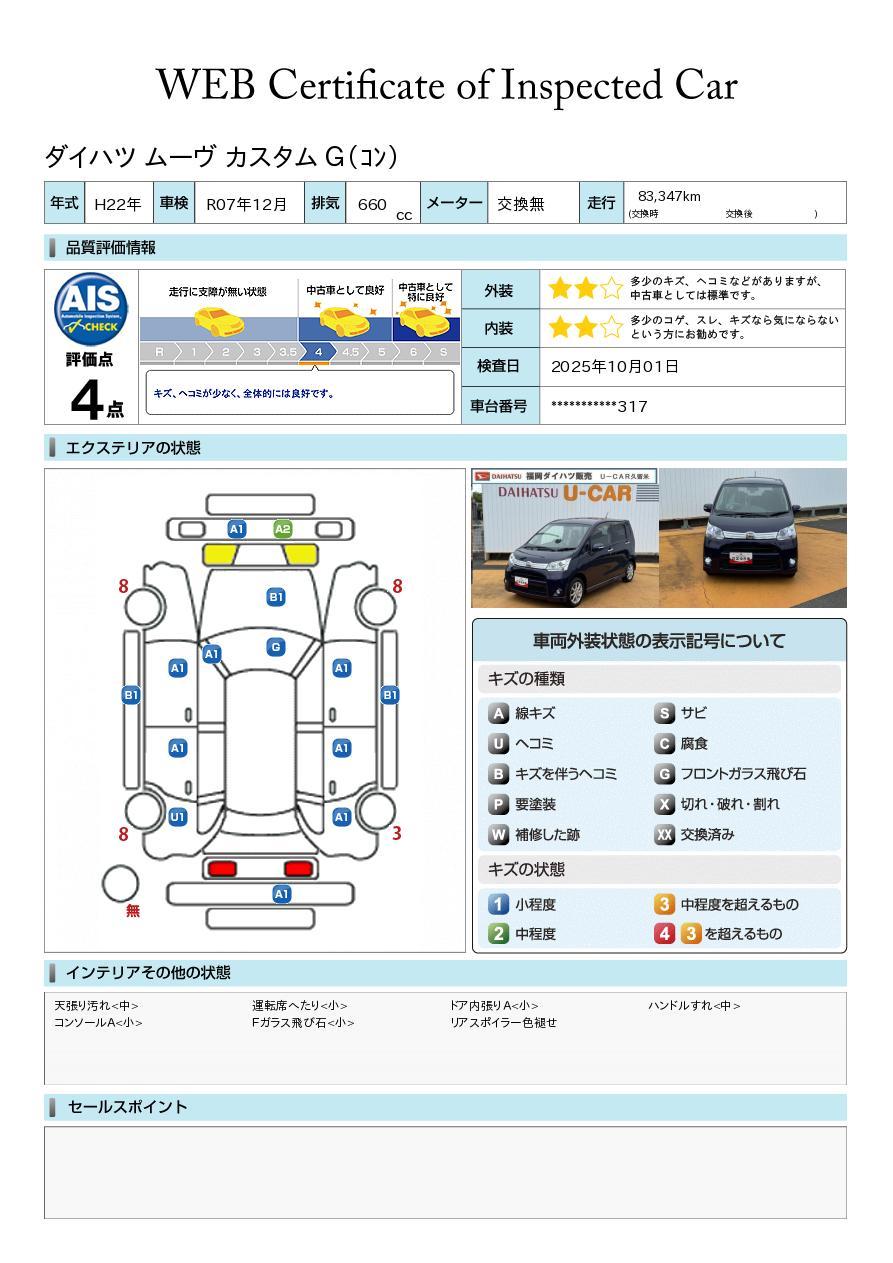 現状の車両の状態に関しましては必ず販売店に確認をお願いします。(2008年10月からの評価基準改定により、一部の車両につき店頭の評価表記と違う場合がございます。詳しくは販売店にお問い合わせください。
