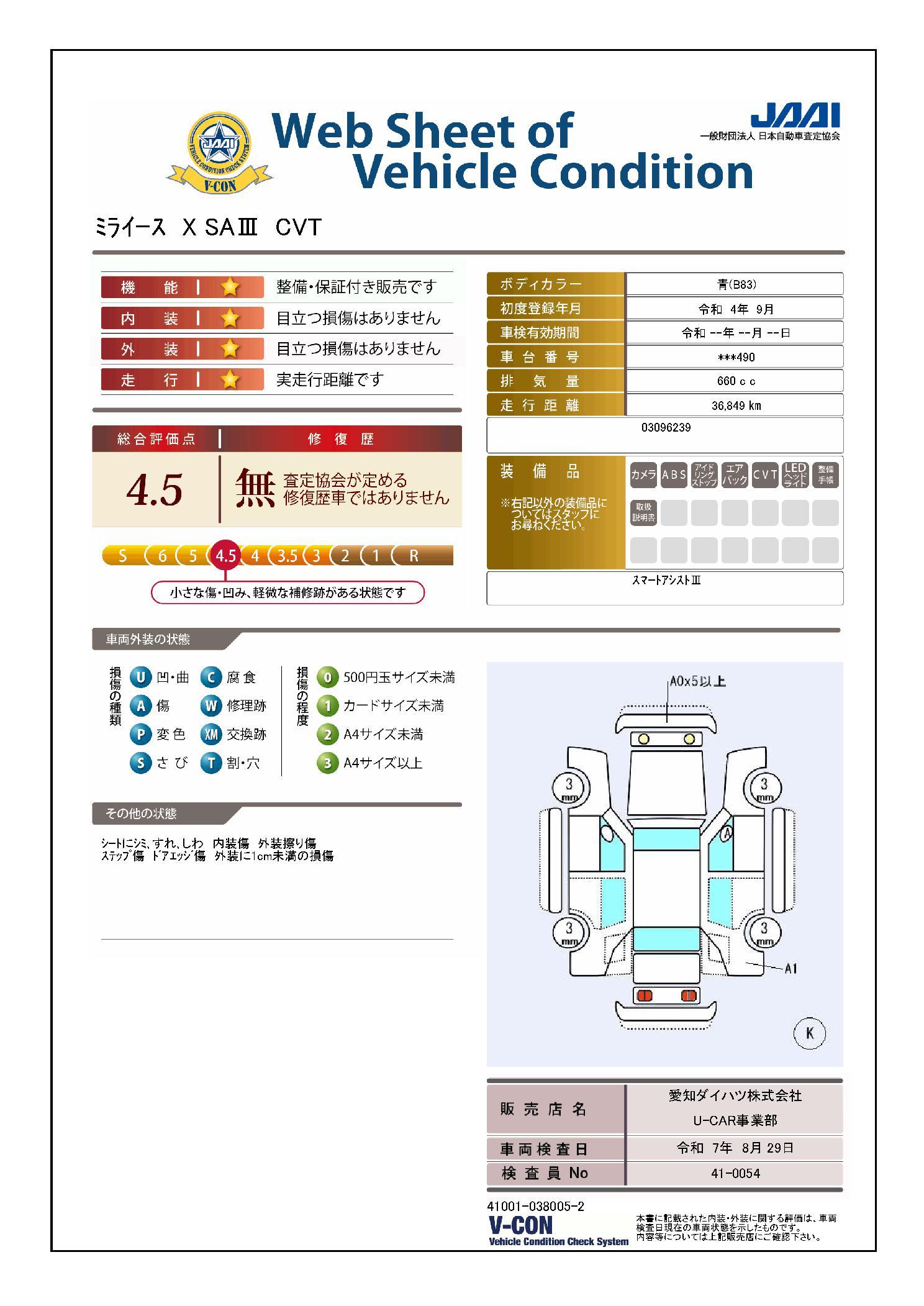 現状の車両の状態に関しましては必ず販売店に確認をお願いします。(2008年10月からの評価基準改定により、一部の車両につき店頭の評価表記と違う場合がございます。詳しくは販売店にお問い合わせください。