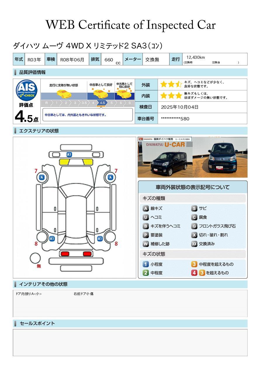 車両状態証明書が付いておりますので、安心してお選び出来ます。詳しくは、スタッフまでお気軽にお問合せください。