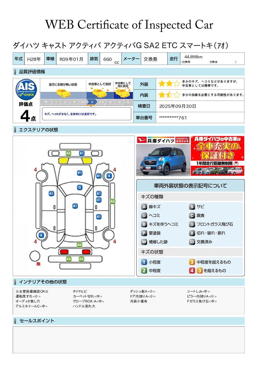 車両状態証明書が付いておりますので、安心してお選び出来ます。詳しくは、スタッフまでお気軽にお問合せください。