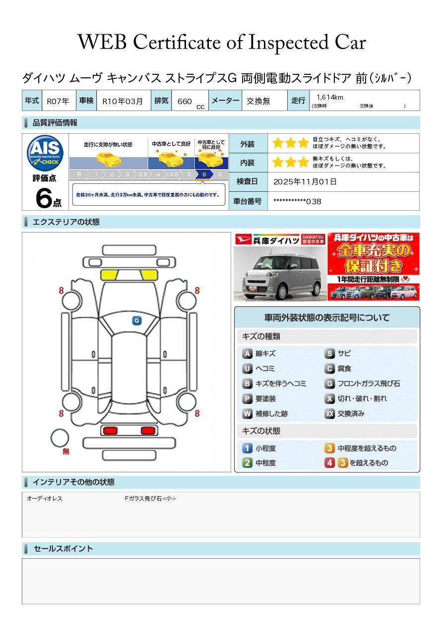 車両状態証明書が付いておりますので、安心してお選び出来ます。詳しくは、スタッフまでお気軽にお問合せください。