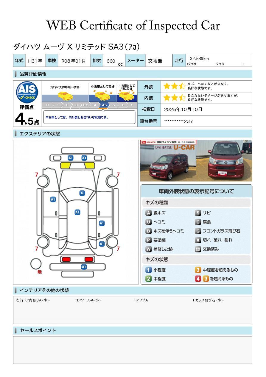 車両状態証明書が付いておりますので、安心してお選び出来ます。詳しくは、スタッフまでお気軽にお問合せください。