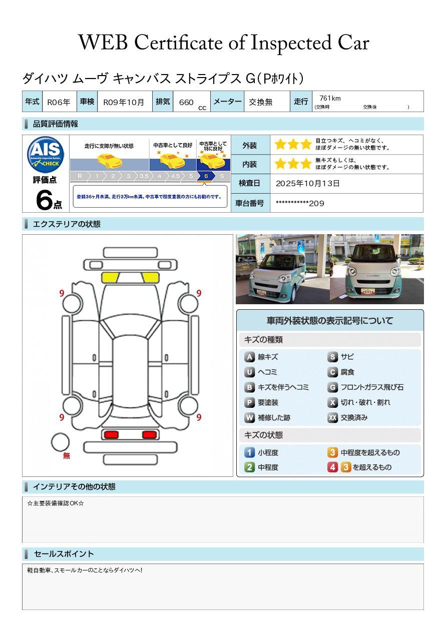 車両状態証明書が付いておりますので、安心してお選び出来ます。詳しくは、スタッフまでお気軽にお問合せください。