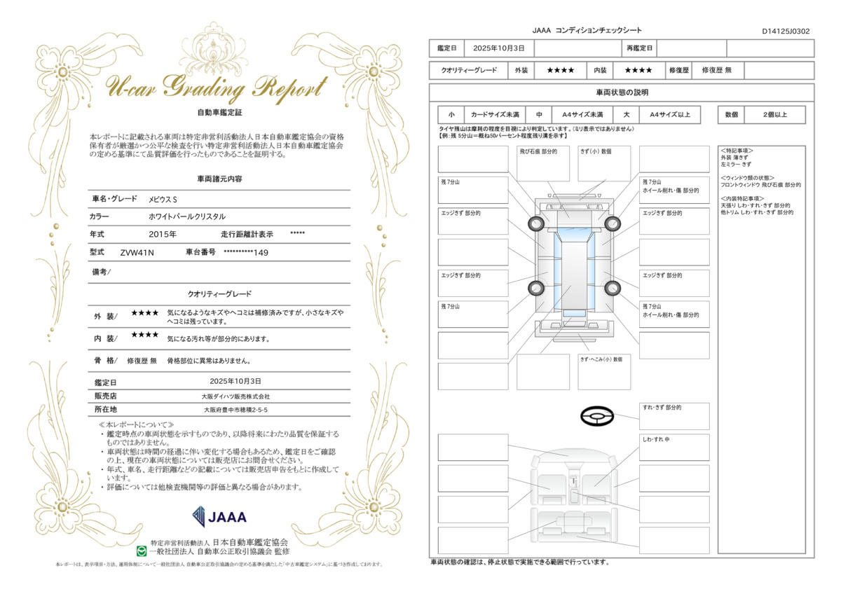 一般財団法人 日本自動車査定協会の車両状態証明書となります。