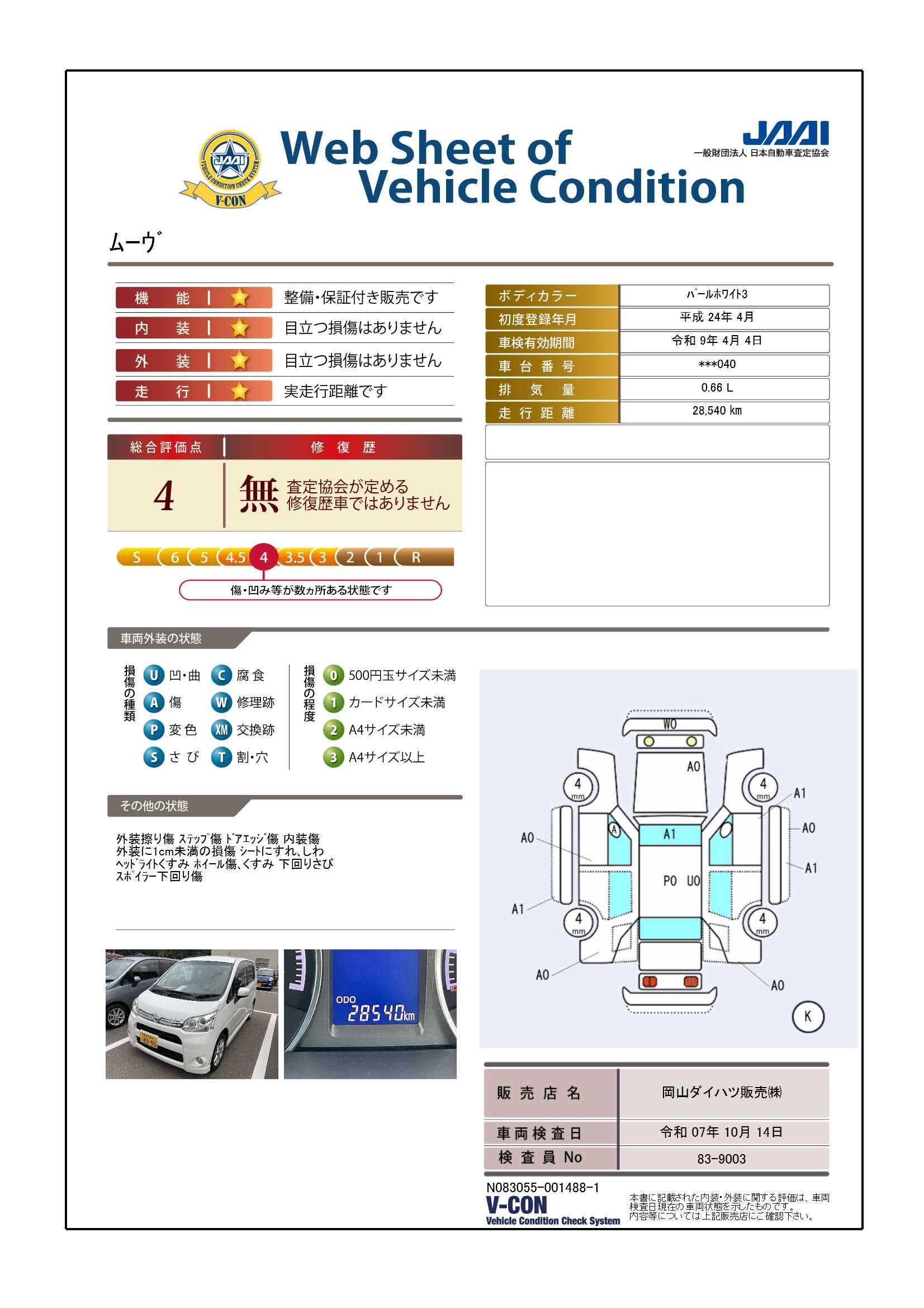 現状の車両の状態に関しましては必ず販売店に確認をお願いします。(2008年10月からの評価基準改定により、一部の車両につき店頭の評価表記と違う場合がございます。詳しくは販売店にお問い合わせください。