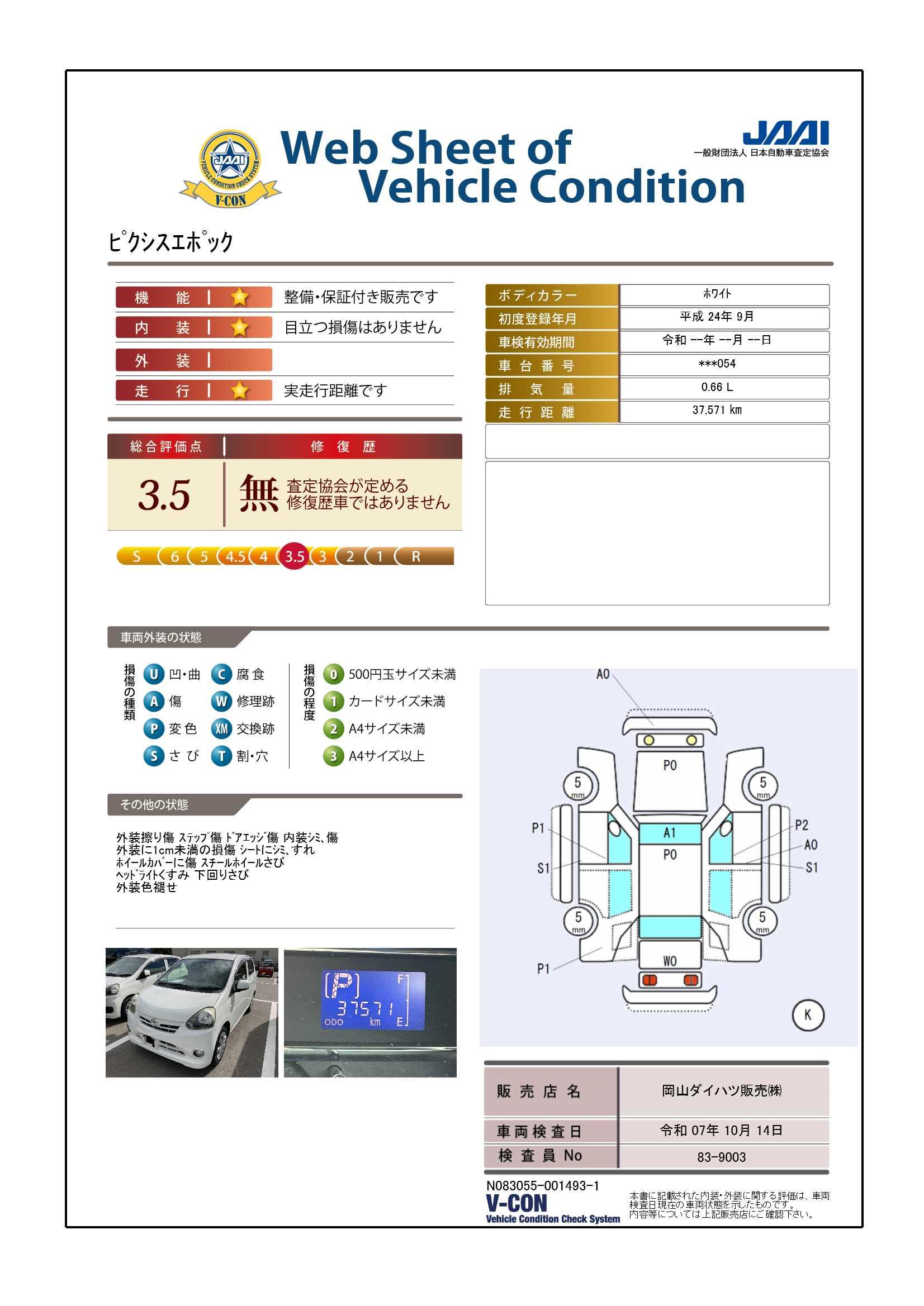 現状の車両の状態に関しましては必ず販売店に確認をお願いします。(2008年10月からの評価基準改定により、一部の車両につき店頭の評価表記と違う場合がございます。詳しくは販売店にお問い合わせください。