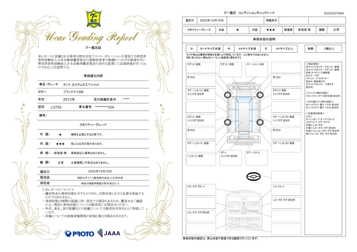 中古車をお選びいただく際に気になる走行距離や修復歴などに加えてキズ・凹みの有無・状態や消耗品の交換、今までの整備状況が “ダイハツ認定中古車カルテ”でわかります。