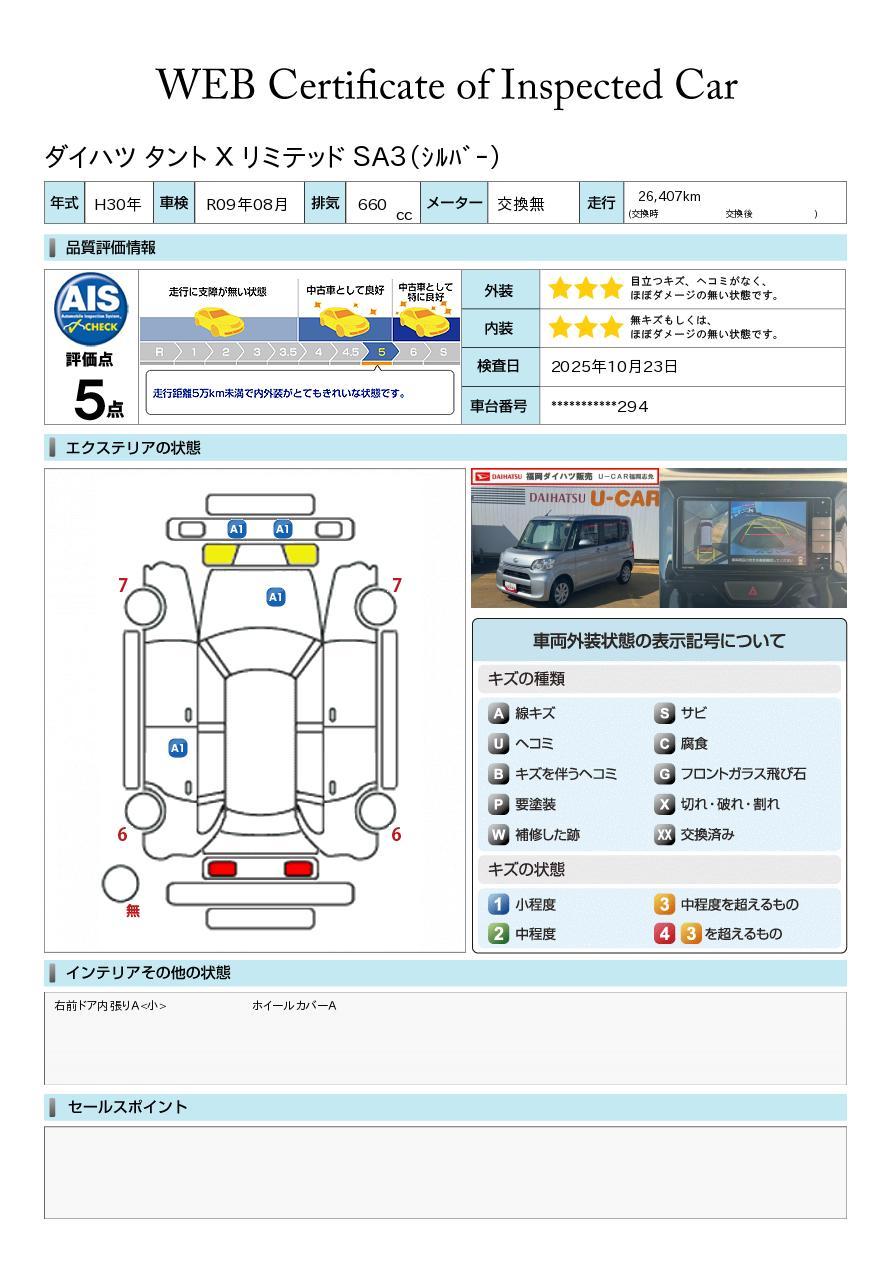 車両状態証明書が付いておりますので、安心してお選び出来ます。詳しくは、スタッフまでお気軽にお問合せください。
