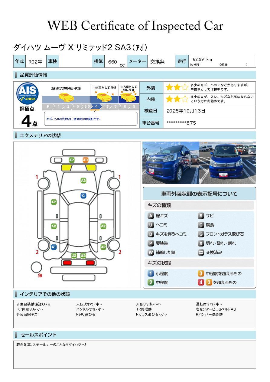 車両状態証明書が付いておりますので、安心してお選び出来ます。詳しくは、スタッフまでお気軽にお問合せください。