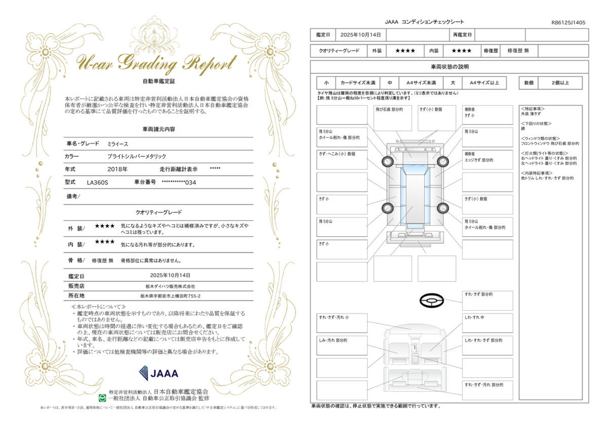 一般財団法人 日本自動車査定協会の車両状態証明書となります。