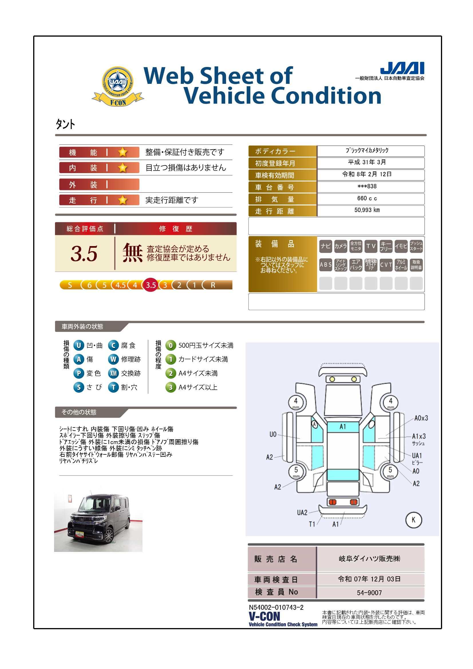 現状の車両の状態に関しましては必ず販売店に確認をお願いします。(2008年10月からの評価基準改定により、一部の車両につき店頭の評価表記と違う場合がございます。詳しくは販売店にお問い合わせください。