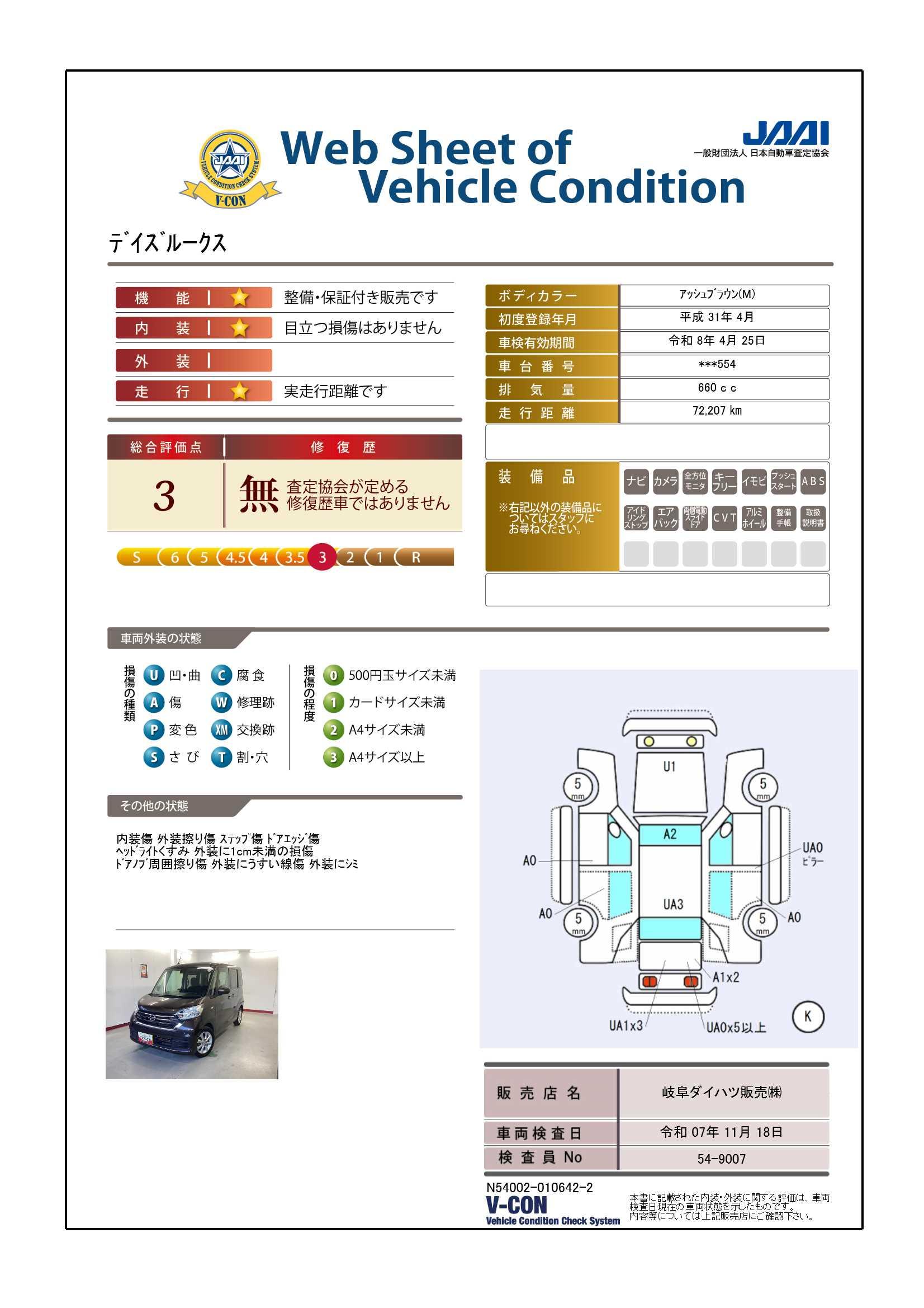 現状の車両の状態に関しましては必ず販売店に確認をお願いします。(2008年10月からの評価基準改定により、一部の車両につき店頭の評価表記と違う場合がございます。詳しくは販売店にお問い合わせください。