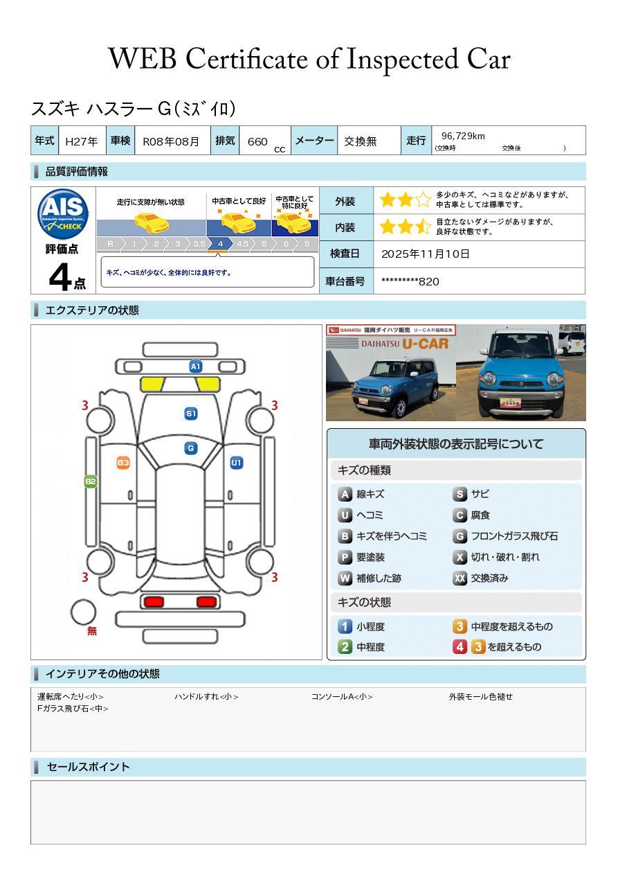 車両状態証明書が付いておりますので、安心してお選び出来ます。詳しくは、スタッフまでお気軽にお問合せください。