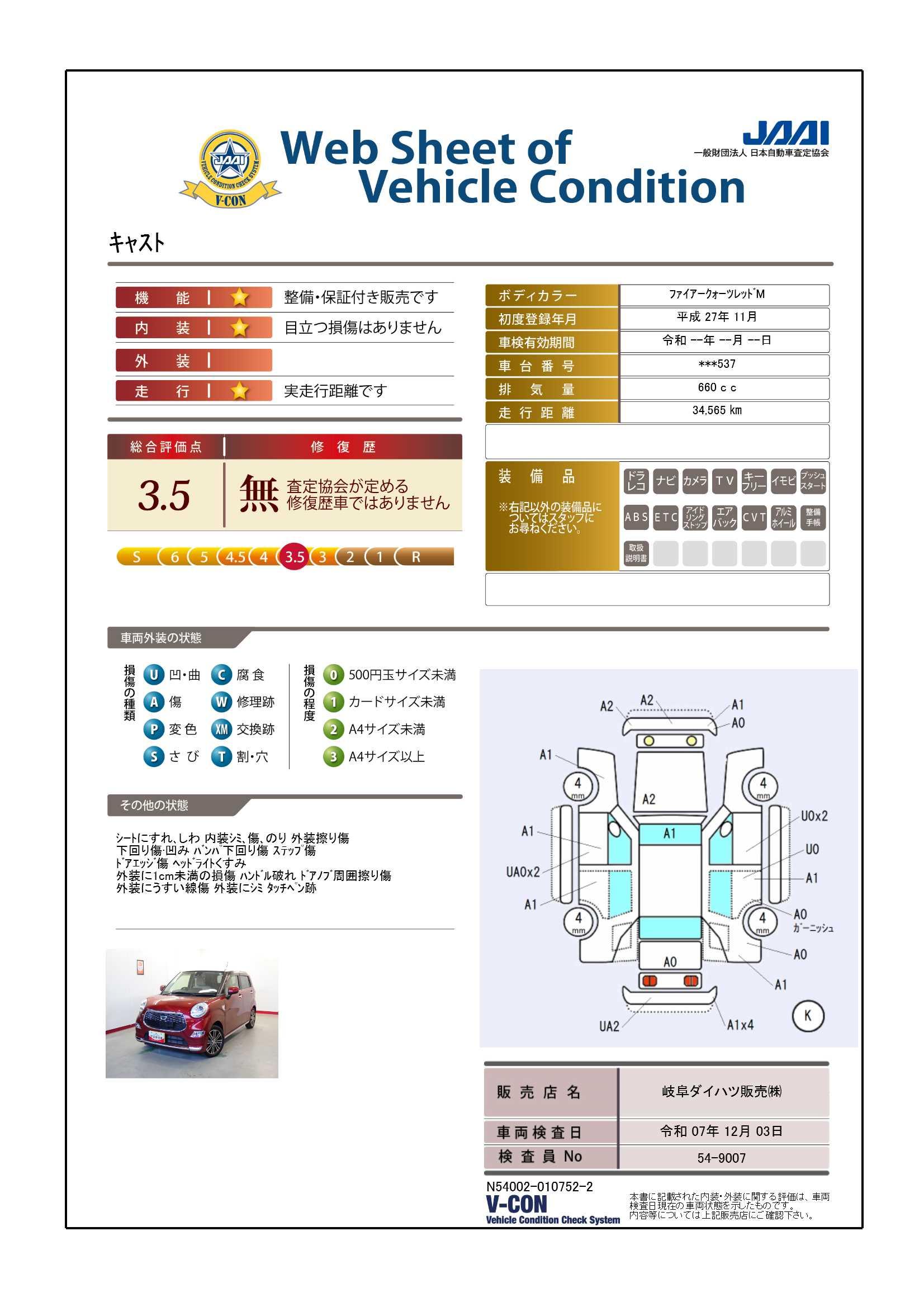 一般財団法人 日本自動車査定協会の車両状態証明書となります。