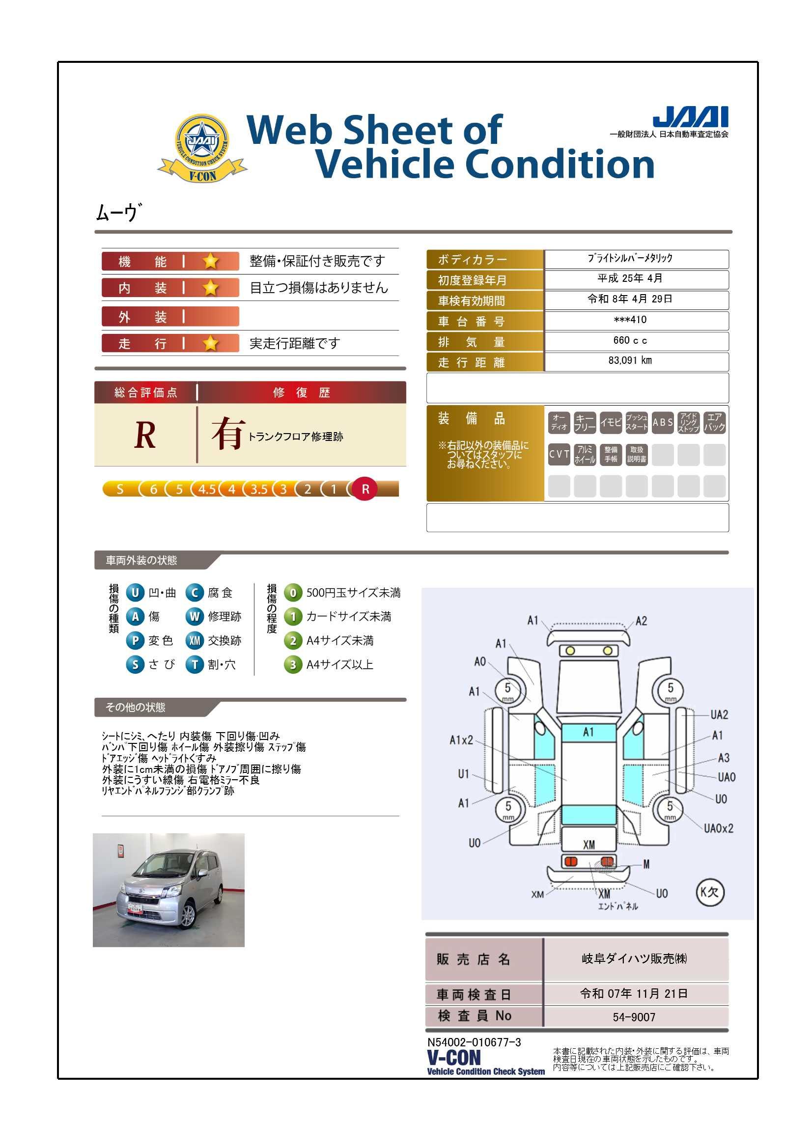 現状の車両の状態に関しましては必ず販売店に確認をお願いします。(2008年10月からの評価基準改定により、一部の車両につき店頭の評価表記と違う場合がございます。詳しくは販売店にお問い合わせください。