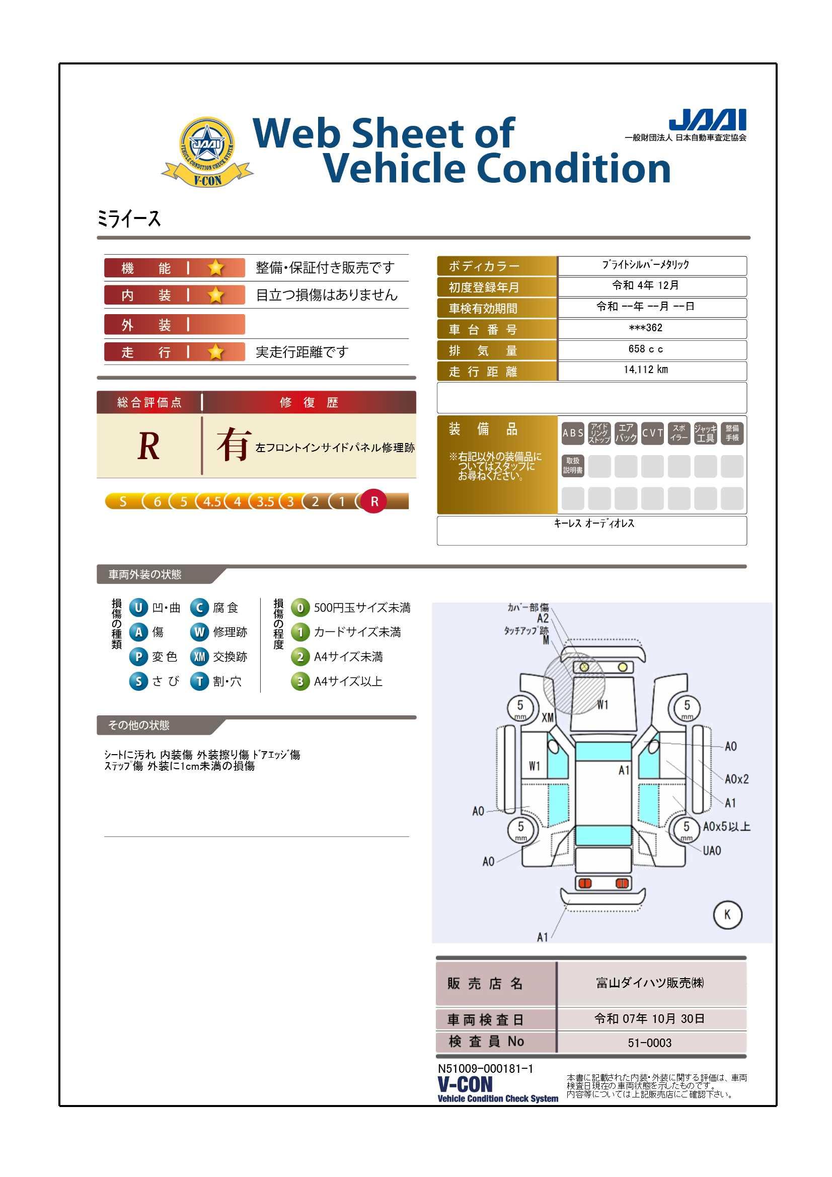 一般財団法人 日本自動車査定協会の車両状態証明書となります。