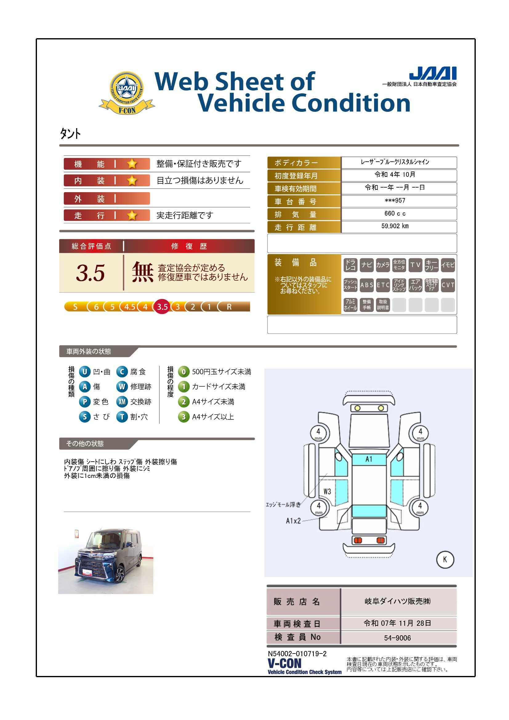 現状の車両の状態に関しましては必ず販売店に確認をお願いします。(2008年10月からの評価基準改定により、一部の車両につき店頭の評価表記と違う場合がございます。詳しくは販売店にお問い合わせください。