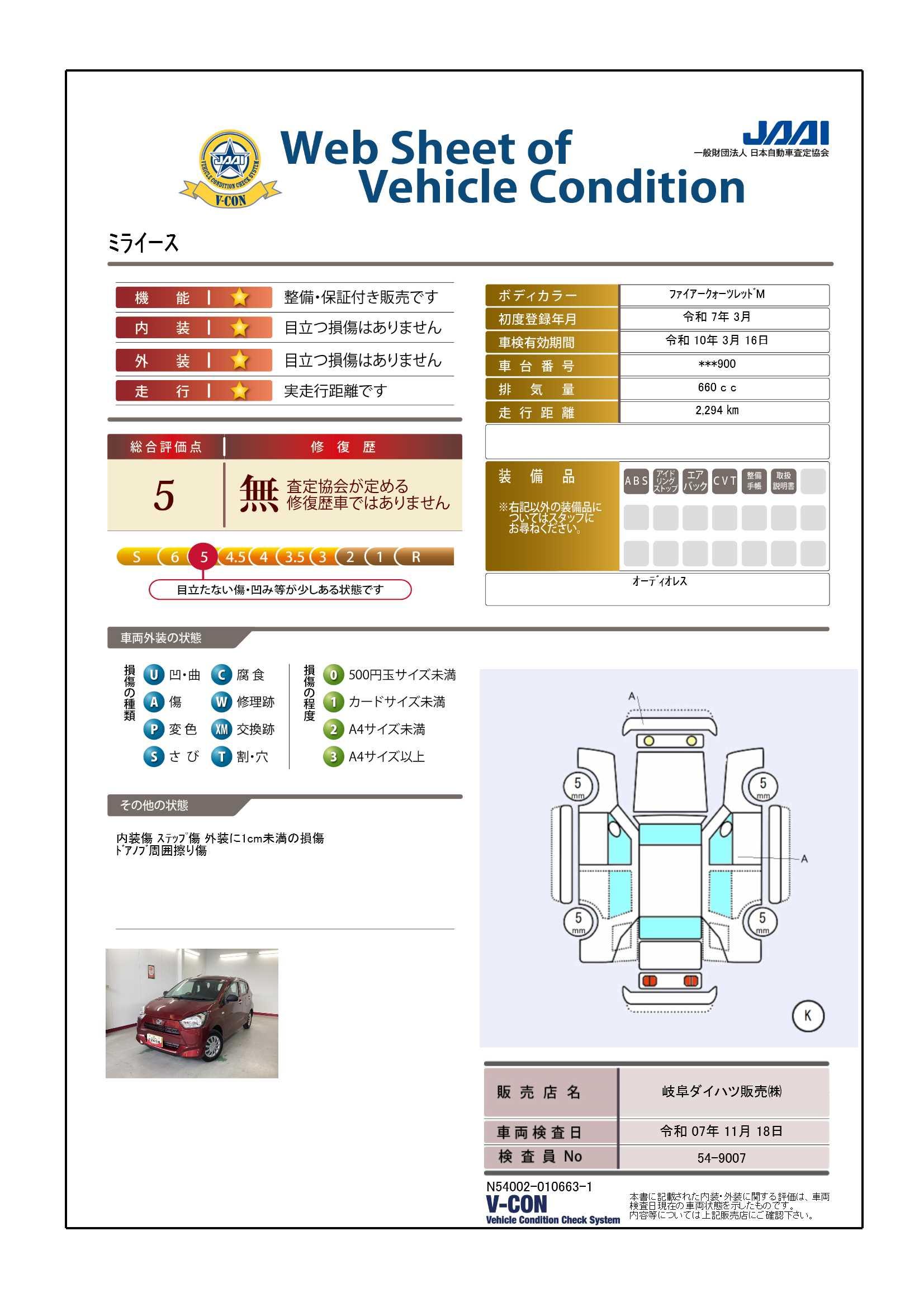 一般財団法人 日本自動車査定協会の車両状態証明書となります。