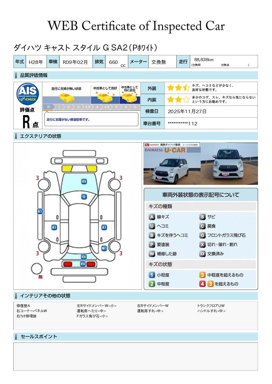 車両状態証明書が付いておりますので、安心してお選び出来ます。詳しくは、スタッフまでお気軽にお問合せください。