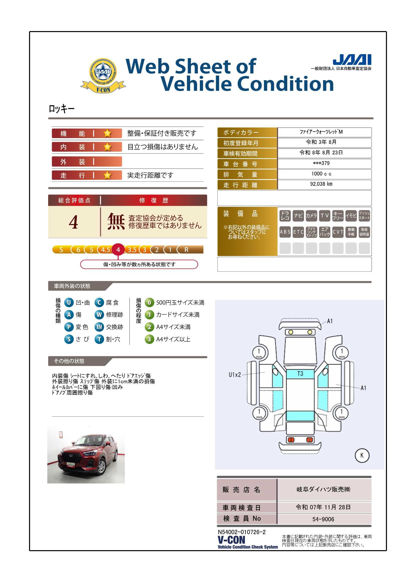 現状の車両の状態に関しましては必ず販売店に確認をお願いします。(2008年10月からの評価基準改定により、一部の車両につき店頭の評価表記と違う場合がございます。詳しくは販売店にお問い合わせください。