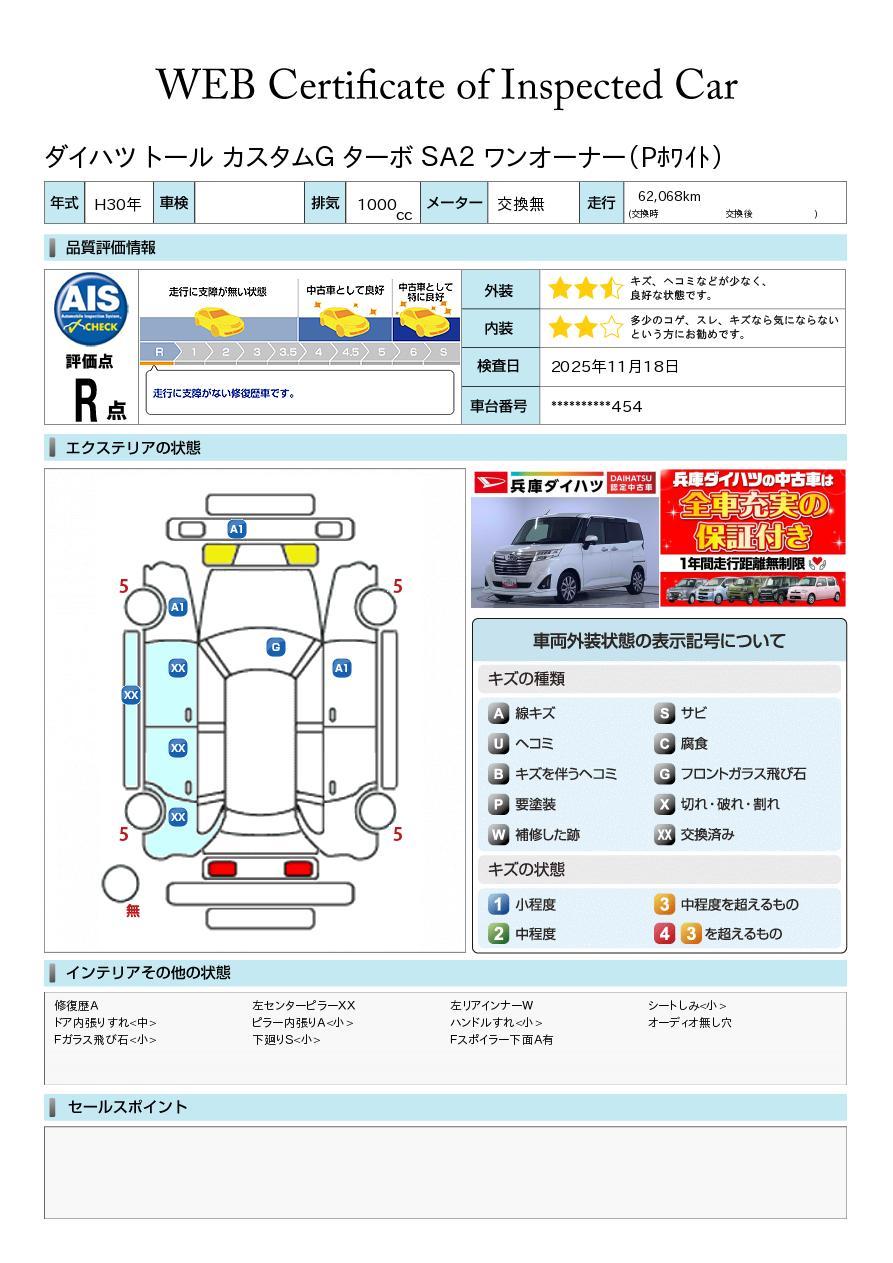 車両状態証明書が付いておりますので、安心してお選び出来ます。詳しくは、スタッフまでお気軽にお問合せください。