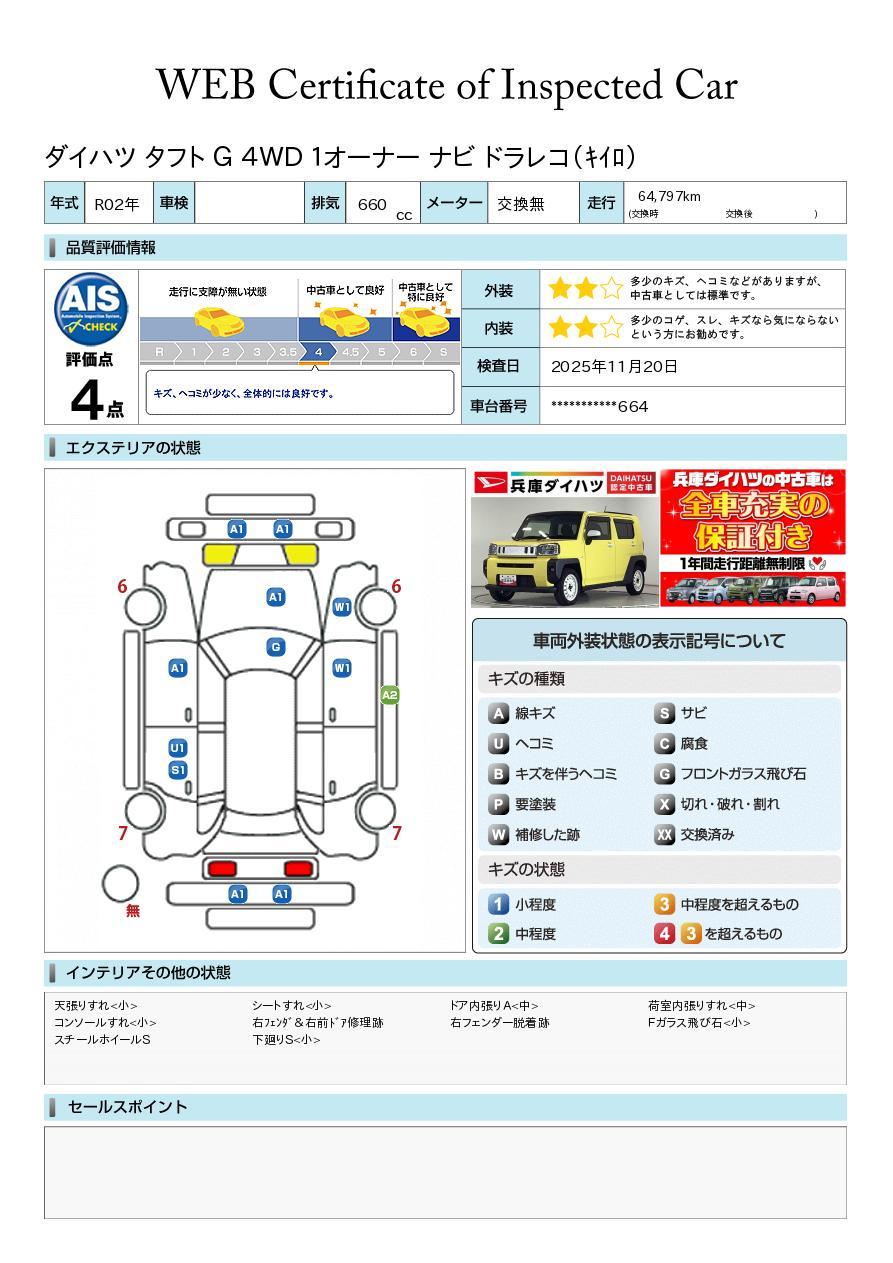 車両状態証明書が付いておりますので、安心してお選び出来ます。詳しくは、スタッフまでお気軽にお問合せください。