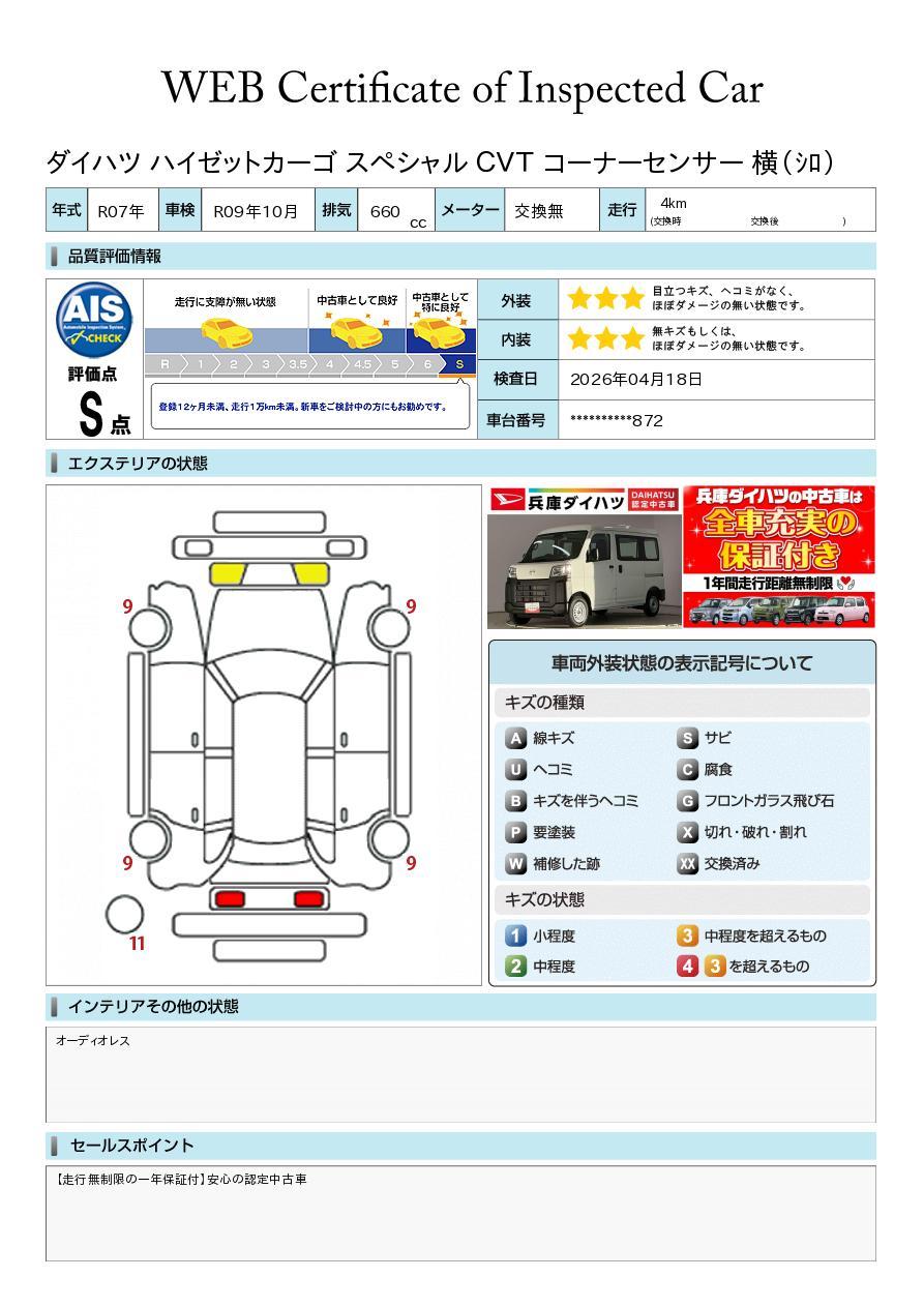 車両状態証明書が付いておりますので、安心してお選び出来ます。詳しくは、スタッフまでお気軽にお問合せください。