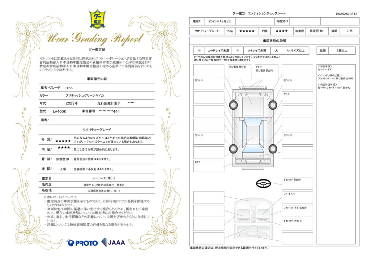 クルマの状態と評価点数を開示し、図解で表示いたしております。車両状態検査書はこちらの車両ページで閲覧できます。(※一部評価書が未設置の車両がある場合がございます)