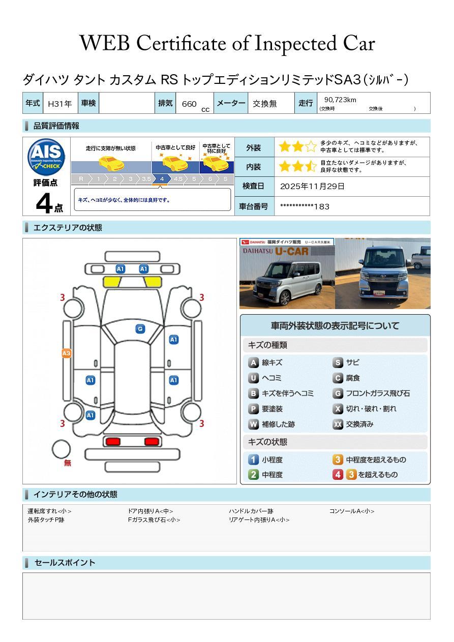 車両状態証明書が付いておりますので、安心してお選び出来ます。詳しくは、スタッフまでお気軽にお問合せください。