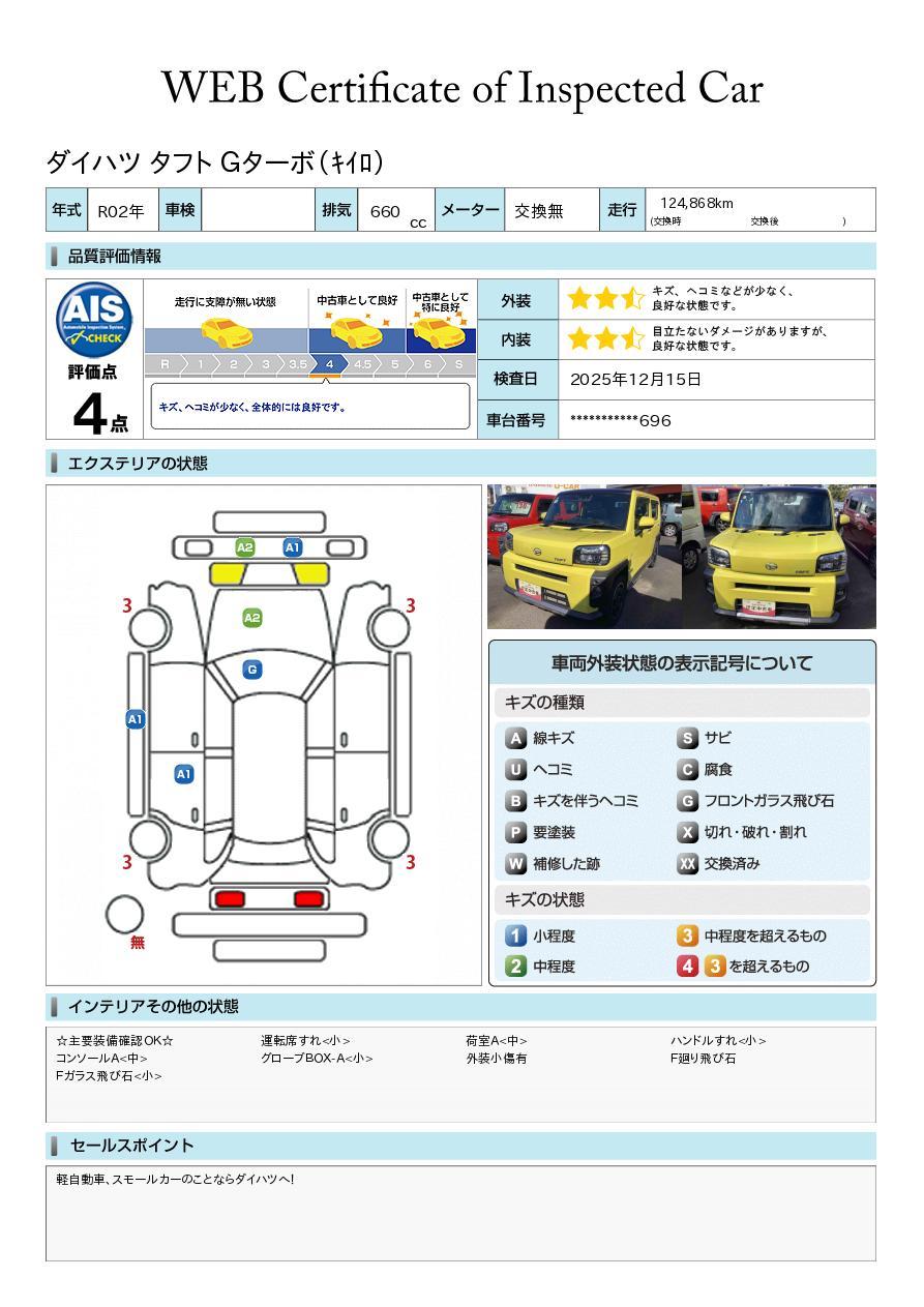 車両状態証明書が付いておりますので、安心してお選び出来ます。詳しくは、スタッフまでお気軽にお問合せください。