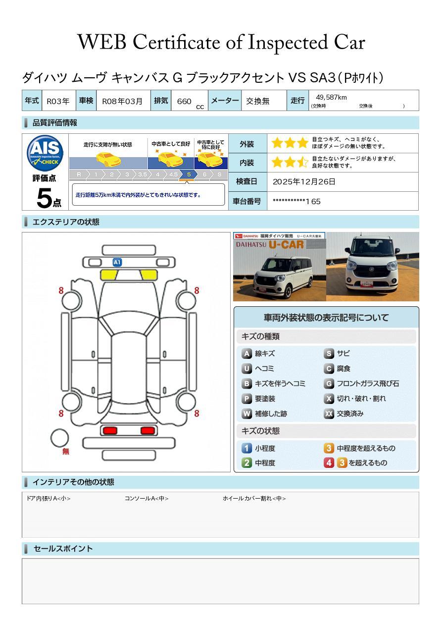ダイハツ認定中古車なら展示車両の状態を開示しております。展示車両に自信があるからこそ出来るサービスです。