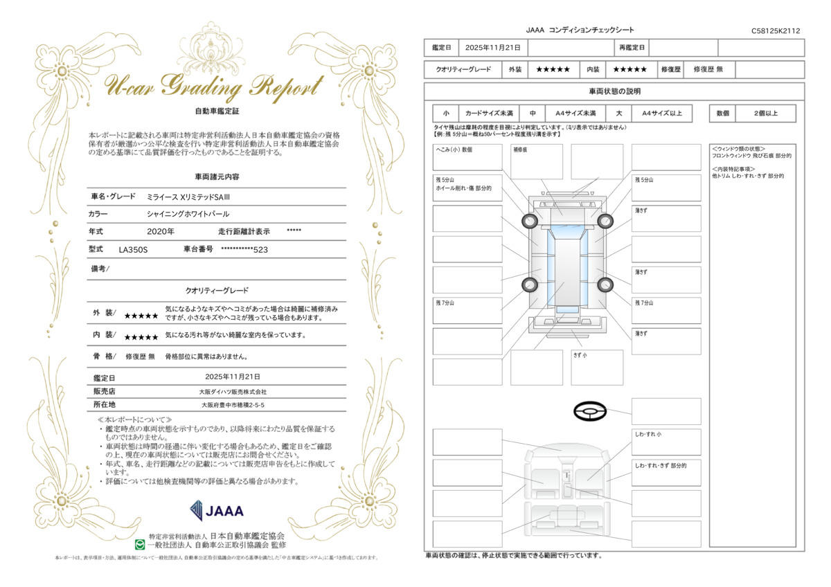 中古車をお選びいただく際に気になる走行距離や修復歴などに加えてキズ・凹みの有無・状態や消耗品の交換、今までの整備状況が “ダイハツ認定中古車カルテ”でわかります。