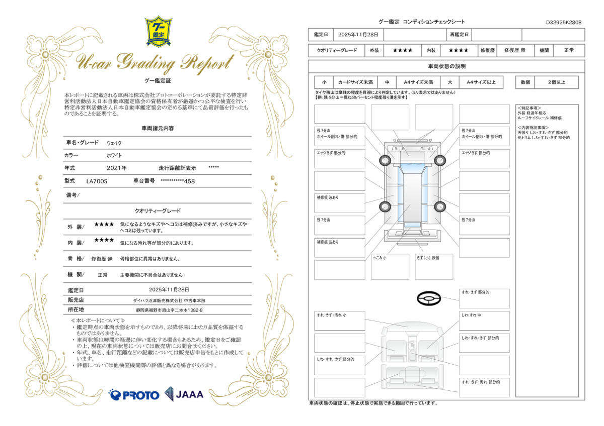 第三者機関の検査員が検査を行った上で発行する「車両状態証明書」付き。クルマの状態を細部までチェックし、わかりやすく表示しているので、安心&納得してご購入いただくことができます。