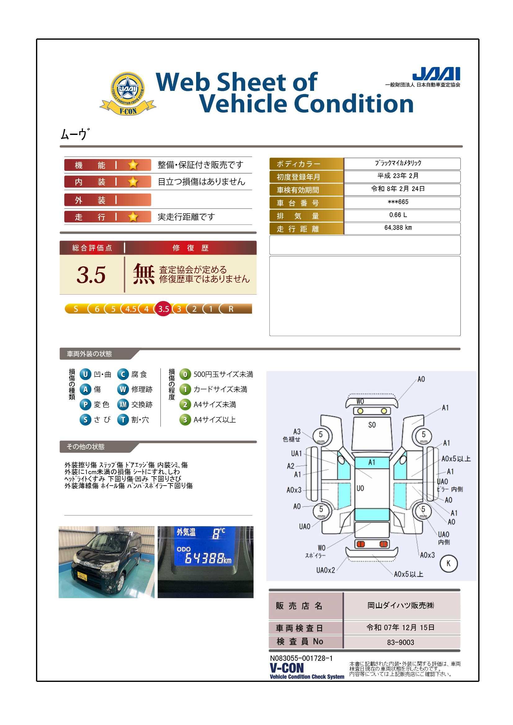 現状の車両の状態に関しましては必ず販売店に確認をお願いします。(2008年10月からの評価基準改定により、一部の車両につき店頭の評価表記と違う場合がございます。詳しくは販売店にお問い合わせください。