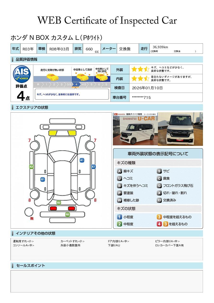 車両状態証明書が付いておりますので、安心してお選び出来ます。詳しくは、スタッフまでお気軽にお問合せください。