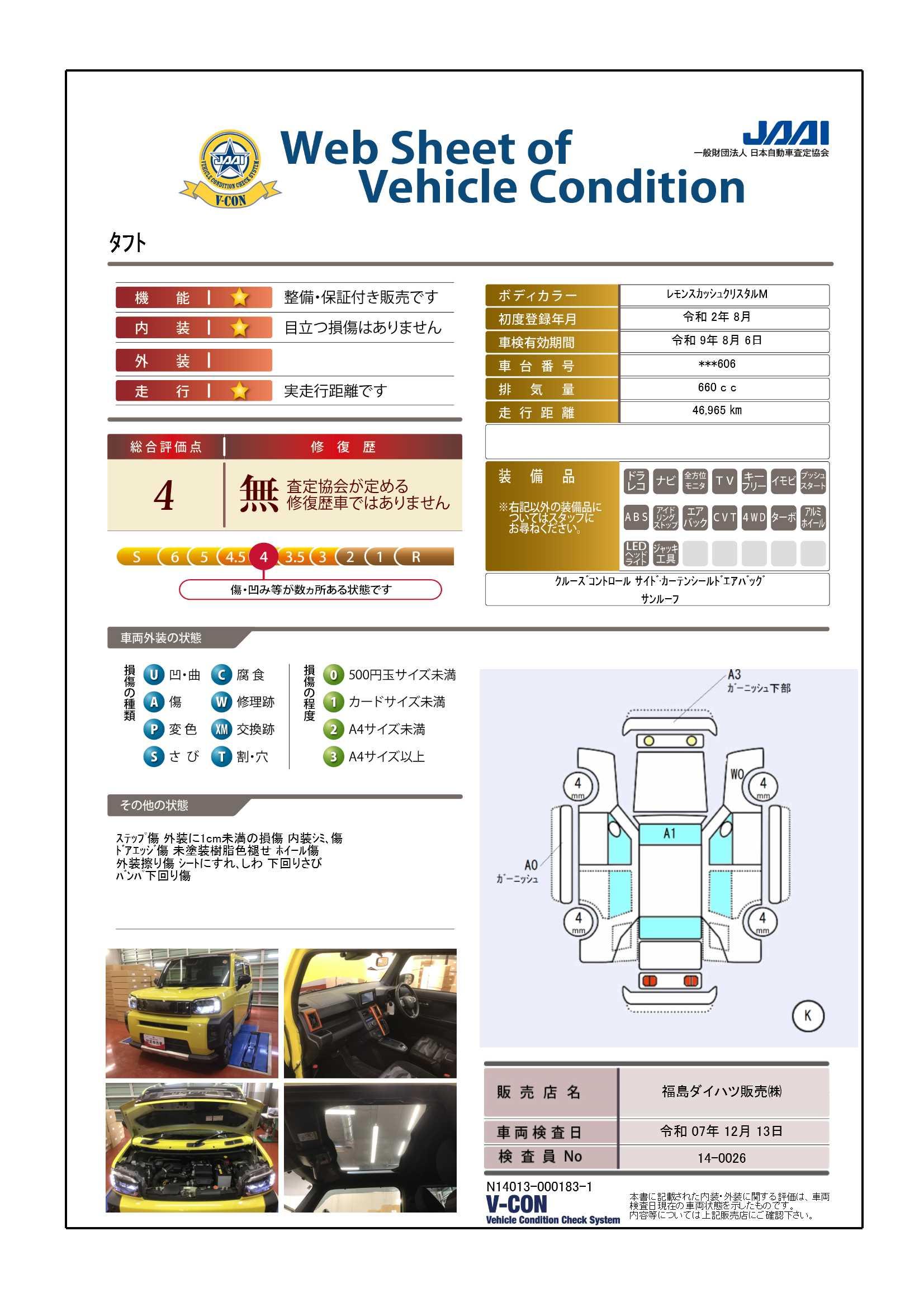 中古車をお選びいただく際に気になる走行距離や修復歴などに加えてキズ・凹みの有無・状態や消耗品の交換、今までの整備状況が “ダイハツ認定中古車カルテ”でわかります。