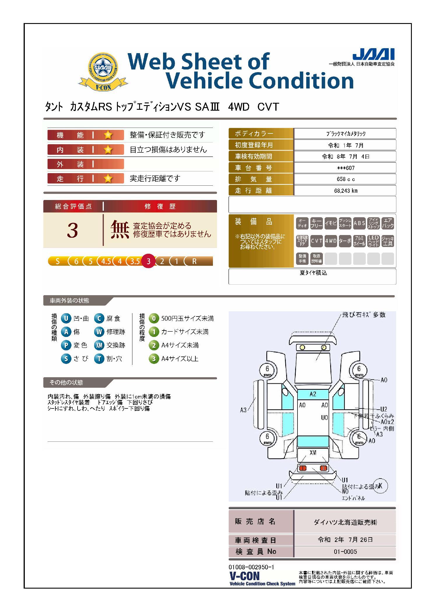 現状の車両の状態に関しましては必ず販売店に確認をお願いします。(2008年10月からの評価基準改定により、一部の車両につき店頭の評価表記と違う場合がございます。詳しくは販売店にお問い合わせください。
