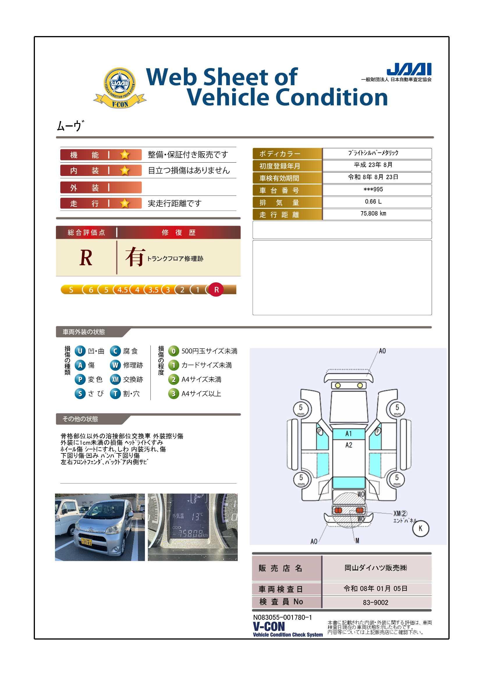 現状の車両の状態に関しましては必ず販売店に確認をお願いします。(2008年10月からの評価基準改定により、一部の車両につき店頭の評価表記と違う場合がございます。詳しくは販売店にお問い合わせください。