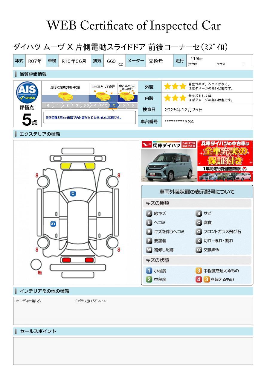 車両状態証明書が付いておりますので、安心してお選び出来ます。詳しくは、スタッフまでお気軽にお問合せください。