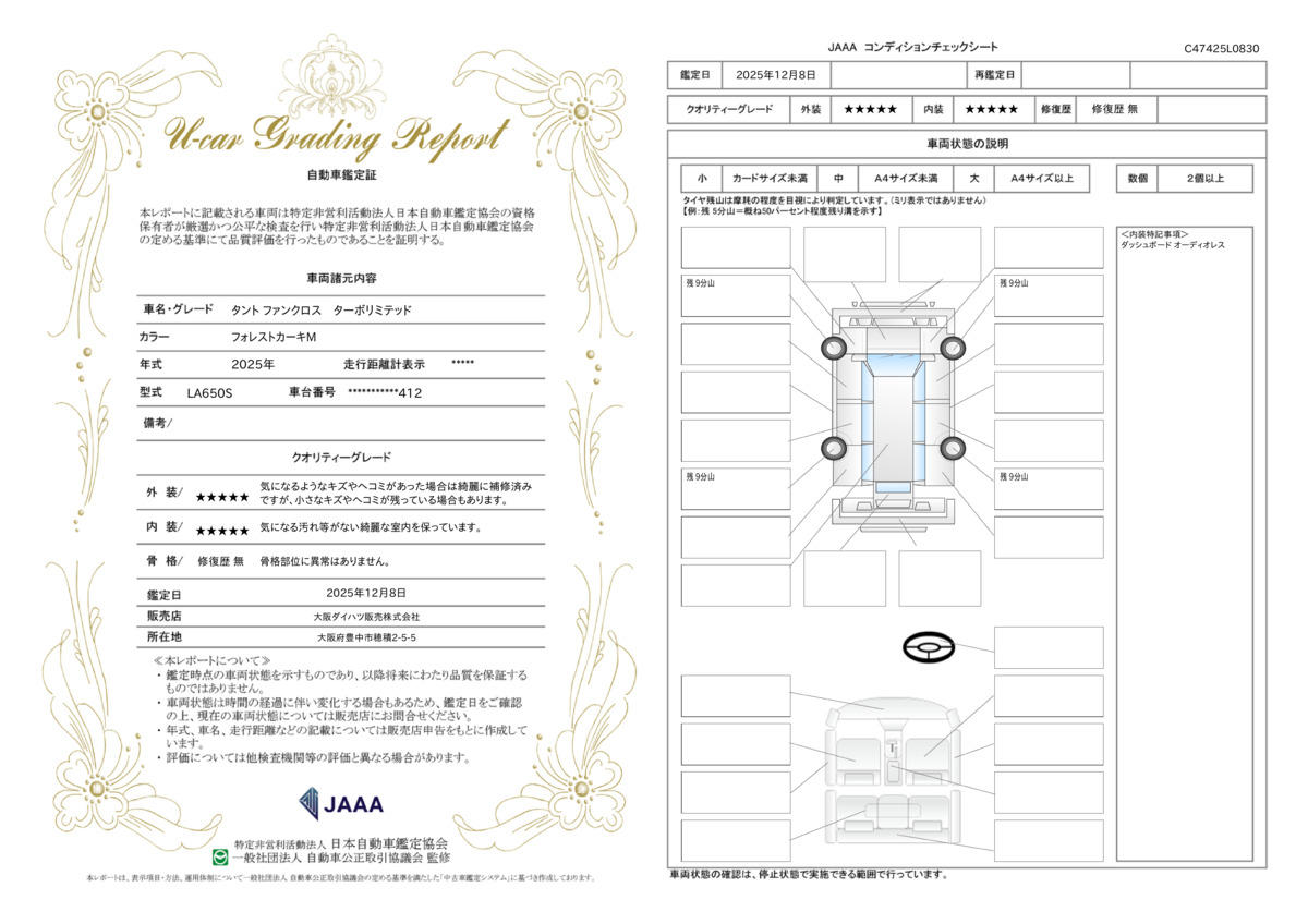 中古車をお選びいただく際に気になる走行距離や修復歴などに加えてキズ・凹みの有無・状態や消耗品の交換、今までの整備状況が “ダイハツ認定中古車カルテ”でわかります。