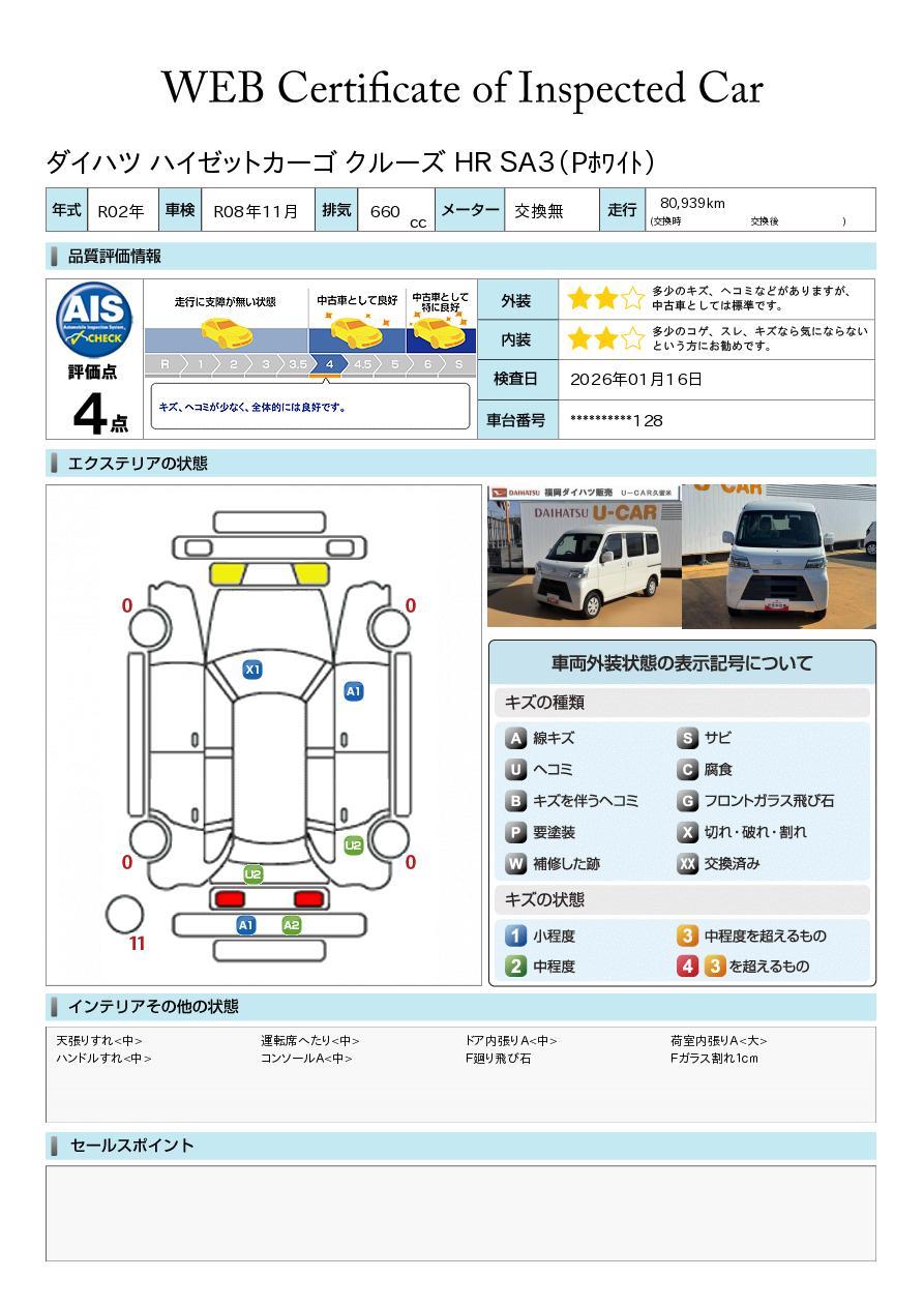 車両状態証明書が付いておりますので、安心してお選び出来ます。詳しくは、スタッフまでお気軽にお問合せください。